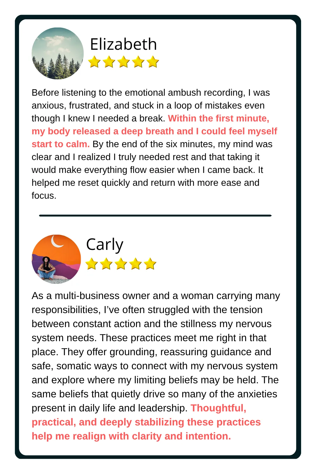 “Before listening to The Sovereign Shift emotional ambush recording, I was anxious, frustrated, and stuck in a loop of mistakes even though I knew I needed a break. Within the first minute, my body released a deep breath and I could feel myself start to calm. By the end of the six minutes, my mind was clear and I realized I truly needed rest and that taking it would make everything flow easier when I came back. It helped me reset quickly and return with more ease and focus" — Elizabeth