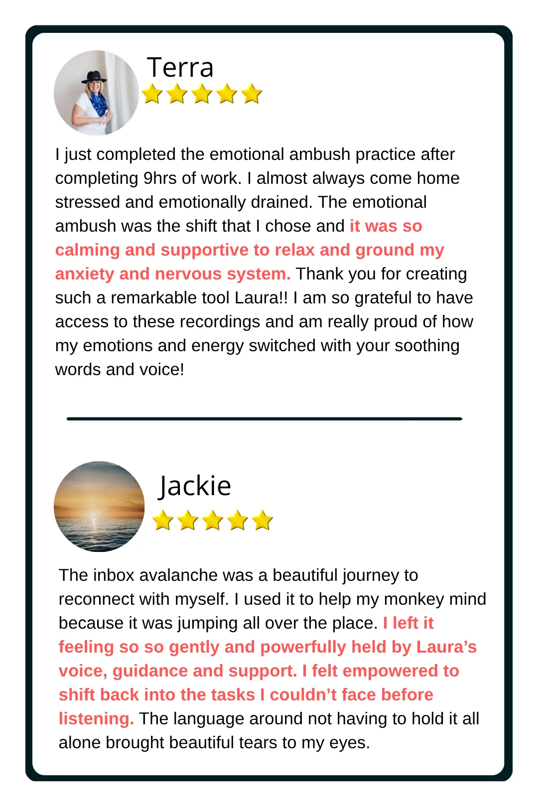 The emotional ambush was the shift that I chose and it was so calming and supportive to relax and ground my anxiety and nervous system. Thank you for creating such a remarkable tool Laura!! I am so grateful to have access to these recordings and am really proud of how my emotions and energy switched with your soothing words and voice! - Terra